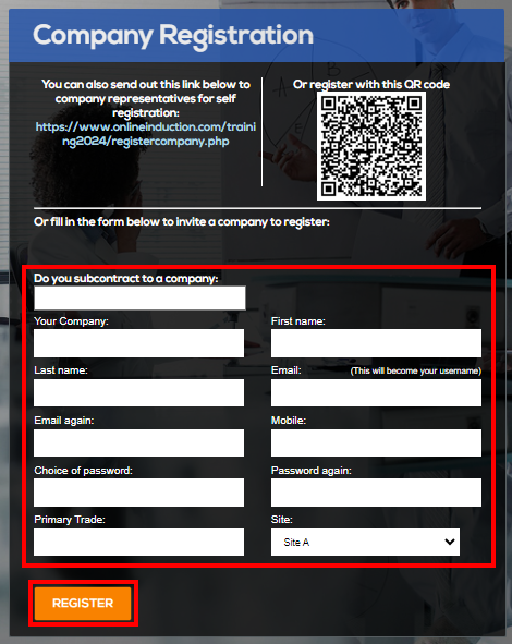 A company account can be registered two ways, direct by the Admin of the Online Induction Portal or inviting the Company to self register using your dedicated link.