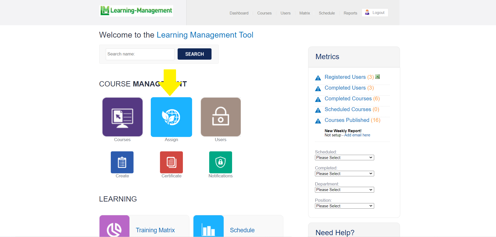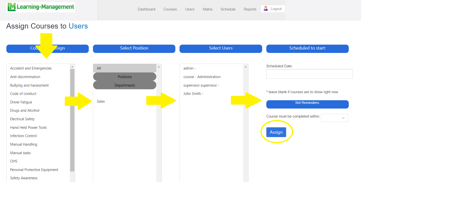 To assign a course or group of courses in LMS, log in to your portal and then select Assign.