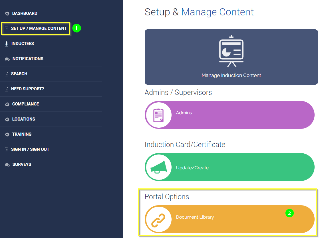If you have not already uploaded your document in the Document Library, do so by navigating to Set Up / Manage Content > Document Library.