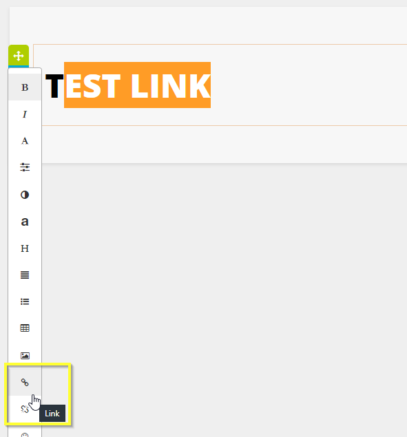 After dragging a text block into the editor, highlight the text that you would like to use a your link. Select the highlighted text and click on the Link button highlighted.