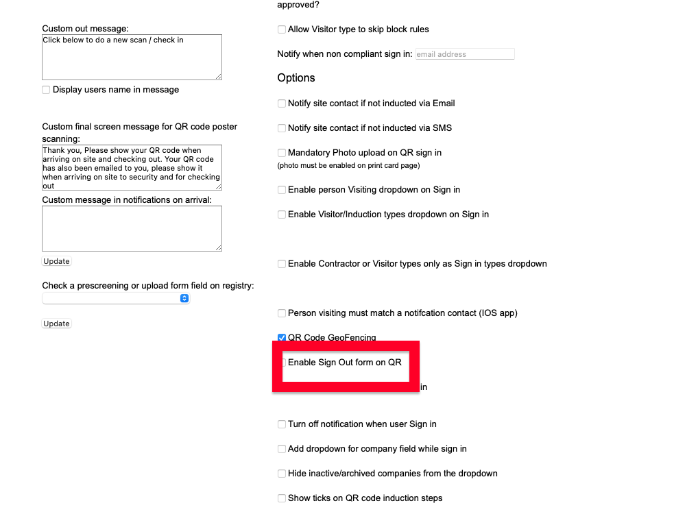 Here you can set questions you wish your Sign in/ Sign out users to view when they sign out using the QR code Method