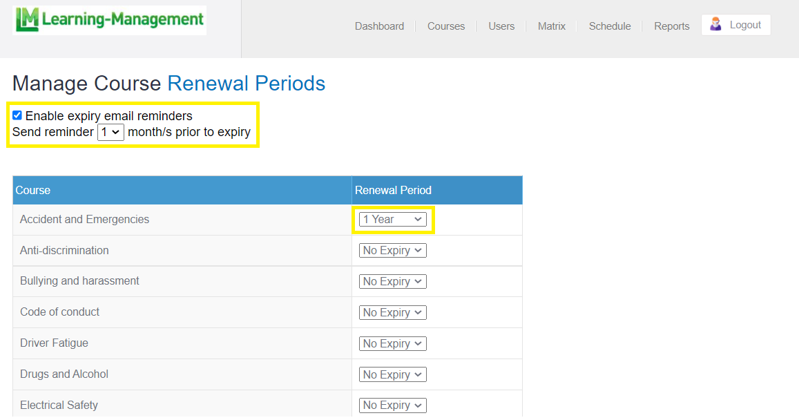Here you will be able to enable expiry email reminders and use dropdowns to create course expiry periods/reminders