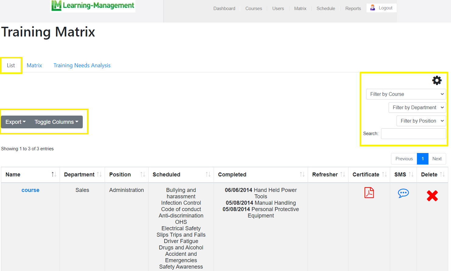 When List is selected, this displays users in the system with which courses are scheduled or completed. It will also give the admin the ability to notify the user, assign new course information, view the user certificate, SMS or even delete the user.