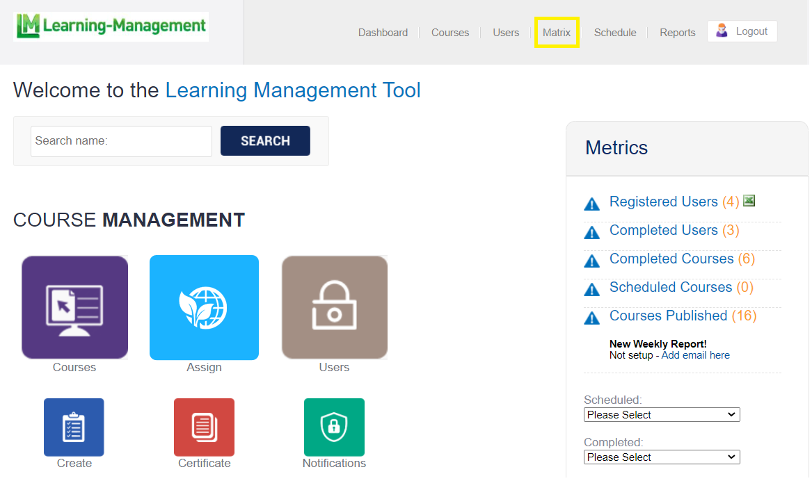 When Matrix is selected, all users with their assigned, unassigned and completed courses will be displayed for an easy to read summary