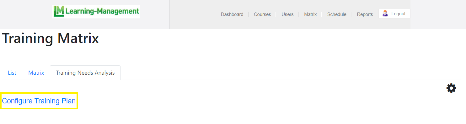 When Training Needs Analysis is selected, admin has the option to create a training plan. This can be done by selecting Configure Training Plan then following the prompts. This tool is useful to further categorise courses when allocating them to users, departments or positions.